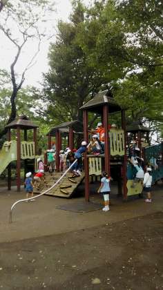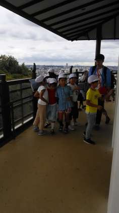 ますがた山で、みんなで展望台から景色を鑑賞し、遊具でたのしんでいます。