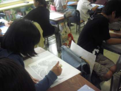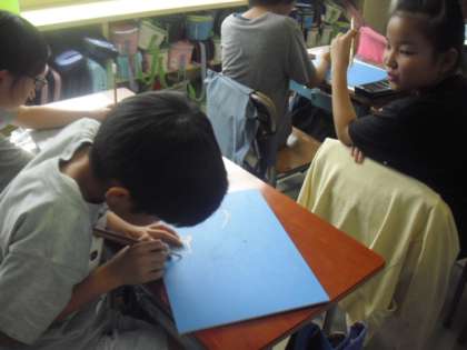 下絵をトレーシングペーパーで写し取り、カーボン紙で板に写し、彫刻刀で掘る作業に取り組んでいました〜