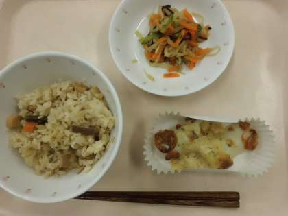 山菜ピラフ・牛乳・ちくわのマヨネーズ焼き・切り干し大根のさっぱりあえ