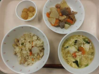 里芋ごはん・牛乳・かきたま汁・大根とこんにゃくの土佐煮・月見だんご