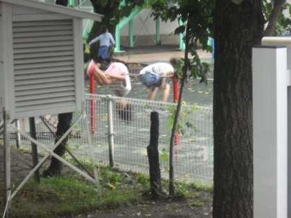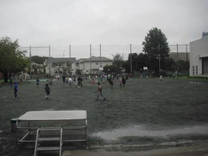 雨のあとで水たまりが残る校庭ですが、子どもたちの活動開始〜