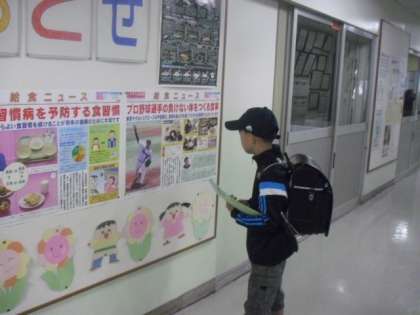 給食室前のニュースに目を通す子ども・・・・