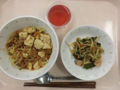 麻婆豆腐焼きそば・牛乳・たこときゅうりのナムル・ぶどうゼリー