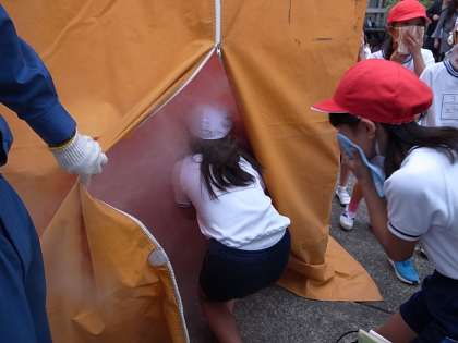 片手で口を覆いながら、もう片手で壁を触って避難するやり方を教わってから、練習用の煙の中を非難する体験をしました。
