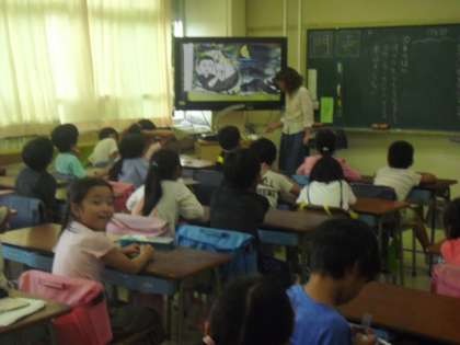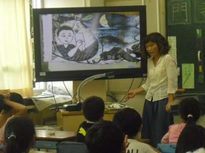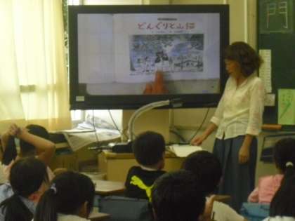 大型画面にうつし出された挿絵を見ながら、先生の読むお話の世界に入っていきました〜