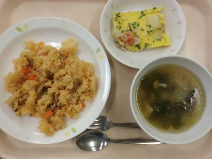 チキンライス・牛乳・スペイン風オムレツ・きのこのスープ