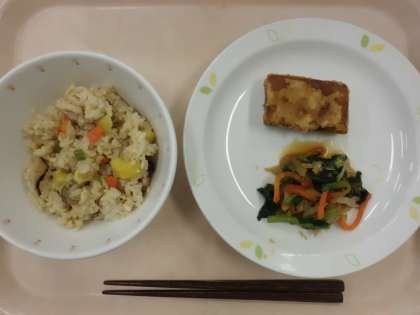 吹き寄せごはん・牛乳・凍り豆腐のから揚げ・小松菜サラダ