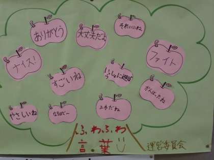 思いやりの心を育てる取り組みの一つとして、子どもたちの児童会運営委員会からの発信でふわふわことばの掲示物が校内に貼られています。