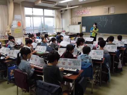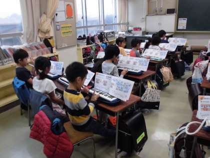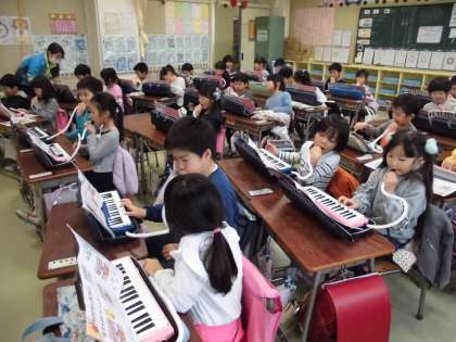 鍵盤ハーモニカの学習です。指遣いに気をつけ、今日も簡単な曲を演奏していました。