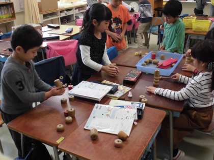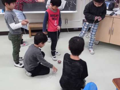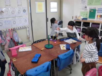 だるま落とし、こま回し、輪投げなどの昔遊びにプレ挑戦中でした。