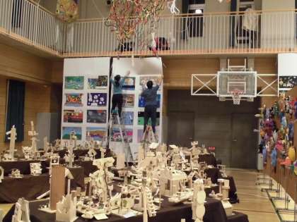 子どもたちの作品ができるだけ輝くように、先生たちも考えながら会場を作り上げています。子どもたちの作品だけでなく、展示の題や説明のボードもぜひ目を通してください。
