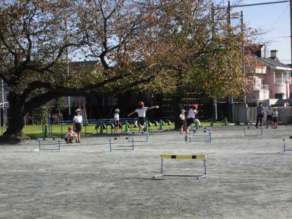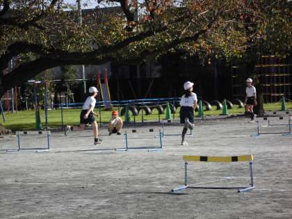 ハードル走ではハードルをリズミカルに走り超えることや、運動に進んで取り組んだり約束を守って友達と助け合て練習や運動をしたりすることを学習しています。