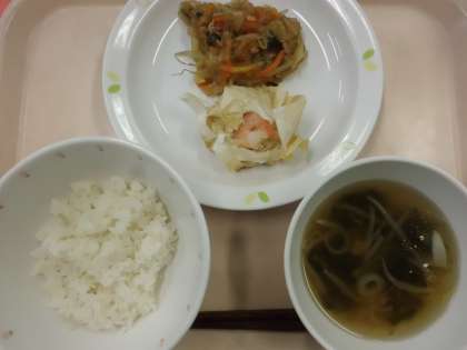 ごはん・牛乳・えびと豆腐のシュウマイ・チャーホーサイ・しめじのスープ