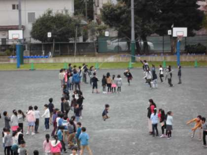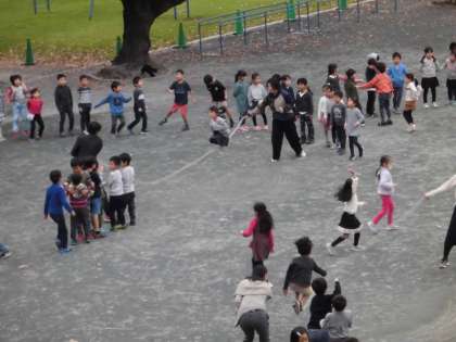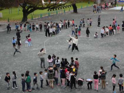 今日も朝活動で、クラスでの長縄とびに取り組んでいる子どもたちです。