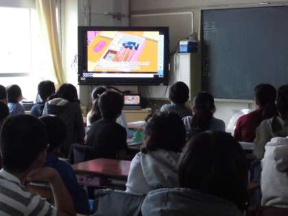 ICT教材を活用して、映像とともに、フレーズの内容を補足して理解を深めていました。