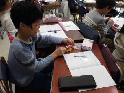 乾電池と豆電球のソケットをどのようにつなぐと電流が流れ、豆電球に明かりがつくのか学習しました。