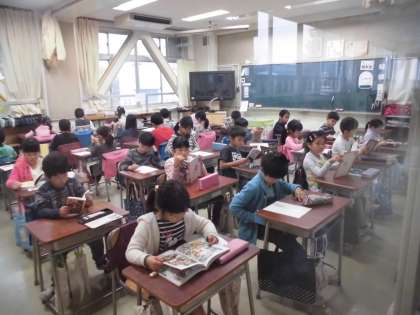 朝読書や子ども同士の読み聞かせ、プリント学習にチャレンジしていました。