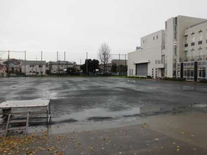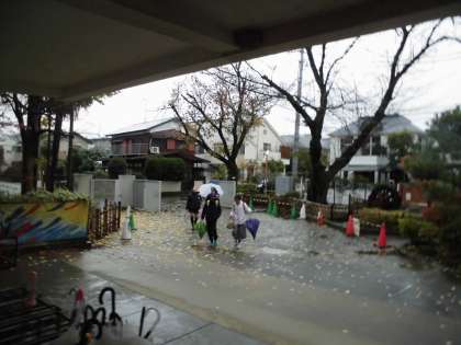 午後から天気は快方に向かうようですが、朝の校庭はまだ水たまりがあります。
