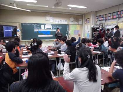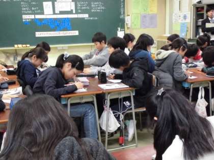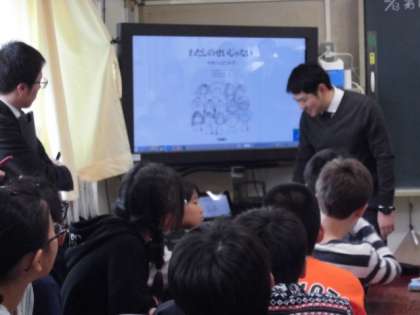 ICTで映した読み聞かせの後、自分の心の目盛りを使って考えを交流し、自分と向き合って考えたことを書き記しました。