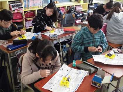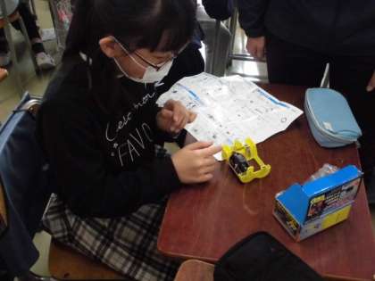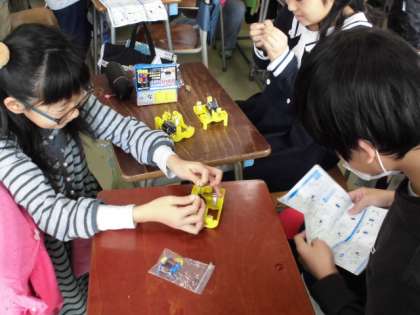 電流が流れている導線のまわりに、磁石の力が働いていることを実験道具を組み立てて確認です。