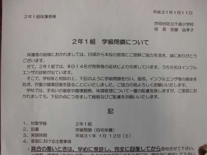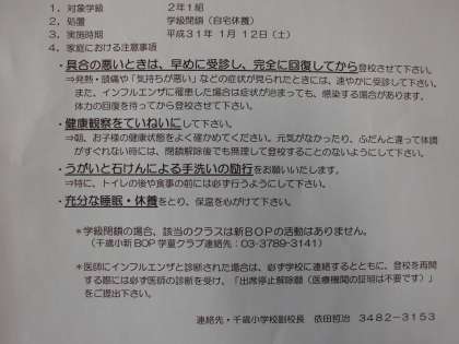 そこで学校医と相談の上、学級閉鎖を行い、風邪、インフルエンザ等の感染を防ぎ、児童の健康回復を図ることにいたしました。