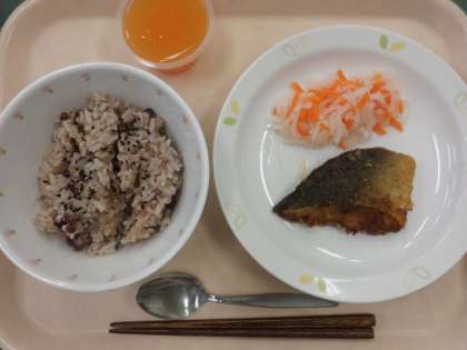 小豆ごはん・牛乳・ぶりの竜田揚げ・紅白なます・キャロットゼリー
