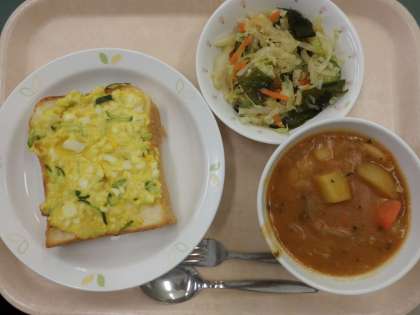 たまごトースト・牛乳・ビーンズシチュー・じゃこサラダ