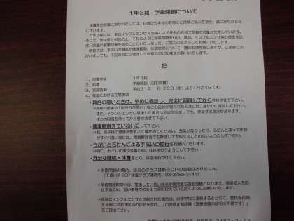 インフルエンザの罹患者が増えた状況を校医と相談の上、1年3組で学級閉鎖を実施します。