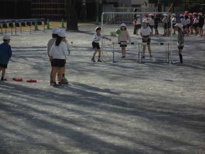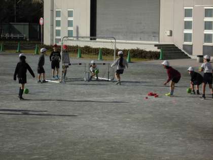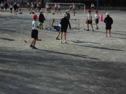校庭で、ボールけりゲームが始まりました。