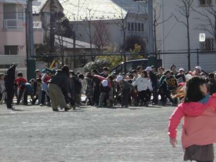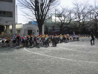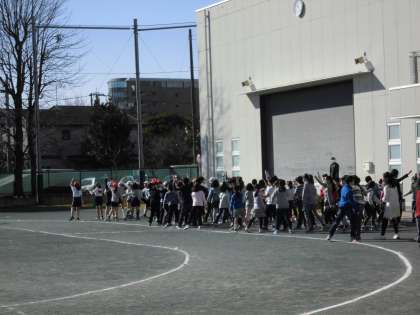 休み時間の持久走への取り組みに向け、準備運動開始です。
