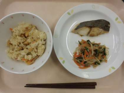 こぎつねごはん・牛乳・銀ひらすの一味焼き・もやしのゴマ風味