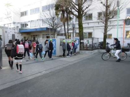 あいさつ隊に迎えられて、今日もスタートです。