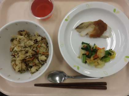 磯おこわ・牛乳・たらのおろしポン酢かけ・白菜のおかかかけ・ぶどうゼリー