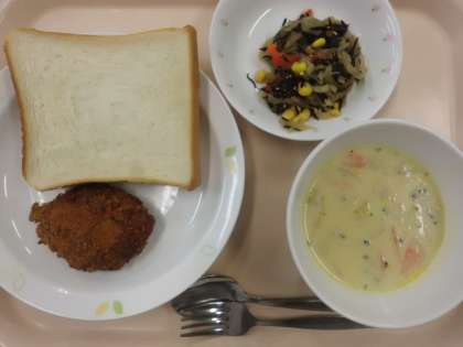 ミルクパン・牛乳・里芋のコロッケ・大根とひじきのサラダ・米粉のコーンスープ