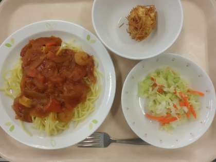 地中海ソーススパゲティ・牛乳・キャベツサラダ・いが栗ぼうや