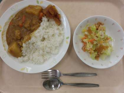 チキンカレーライス・牛乳・福神漬け・パリパリサラダ
