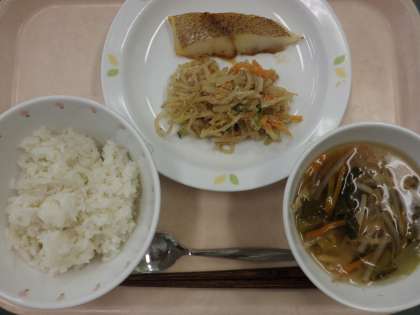 ごはん・牛乳・かれいのしょうが風味焼き・ごま酢かけ・沢煮椀・デザート
