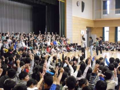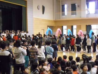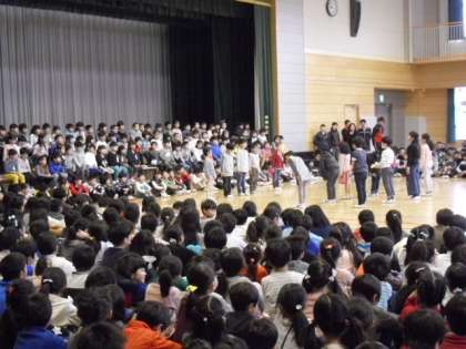 花のアーチをくぐって入場した1年生に、千歳小のことをクイズなどで伝えました。