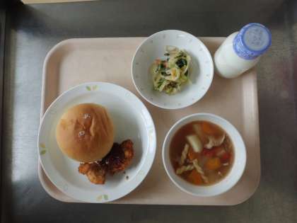 丸パン・牛乳・白身魚のフライ・小松菜サラダ・ミネストローネ