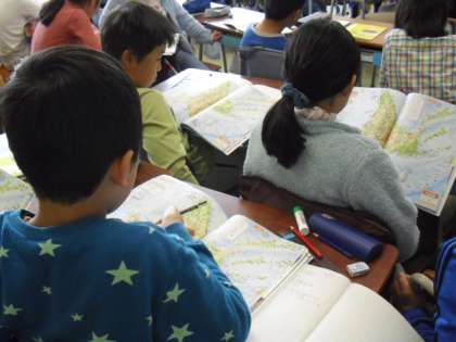 5年生では地図帳や地球儀、統計などの各種の基礎的資料を通して、情報を適切に調べまとめる技能を身に付けていきます。