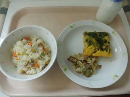 三食ピラフ・牛乳・たまご焼き・ごぼうチップスサラダ