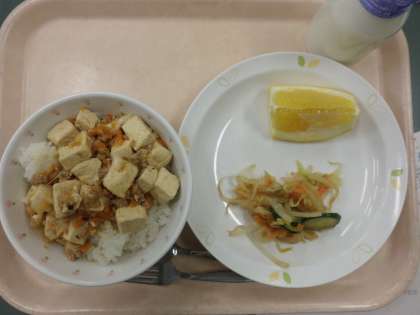 麻婆豆腐丼・牛乳・中華サラダ・くだもの(美生柑)