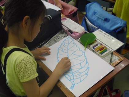 大きな葉っぱをスケッチしています。