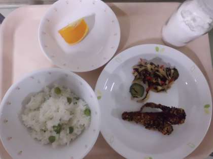 グリーンピースごはん・牛乳・魚のごまフライ・