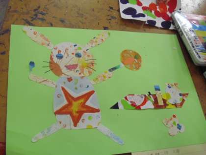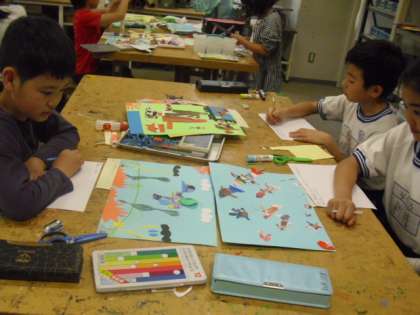 絵の具で自分折り紙を作り、そこからオリジナル主人公を作る活動に取り組んでいました。