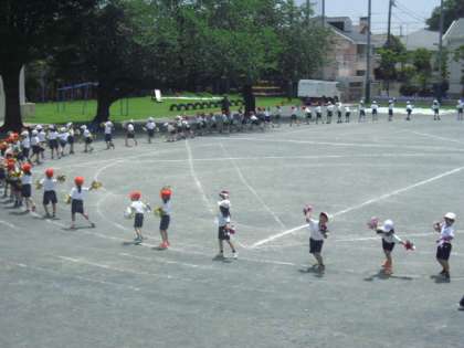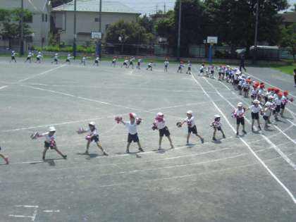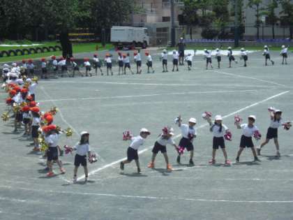 校庭で、ボンボンを振りながら、元気に踊っていました。