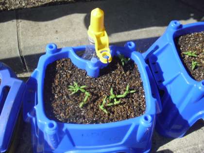 朝、登校して、2年生の子どもたちが、生活科で育てているミニトマトに水やりをしていました。