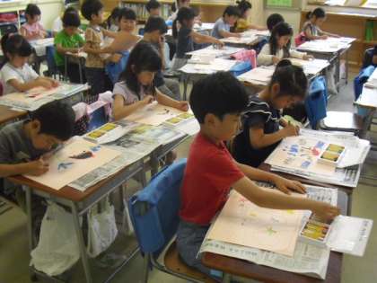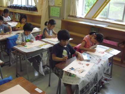 1年生は色画用紙にクレパスを使って描きます。