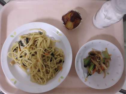 キャベツとチキンの塩こうじスパゲティ・牛乳・からしあえ