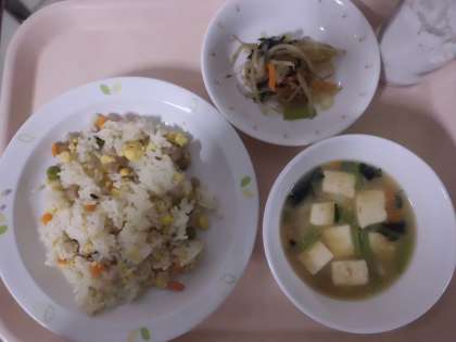 チャーハン・牛乳・青菜と春雨のソテー・中華風コーンスープ